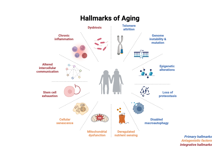 These hallmarks span molecular damage, disregulated stress responses, failures in intercellular communication, genome instability and epigenetic alterations among many others, that together drive chronic disease and functional decline.